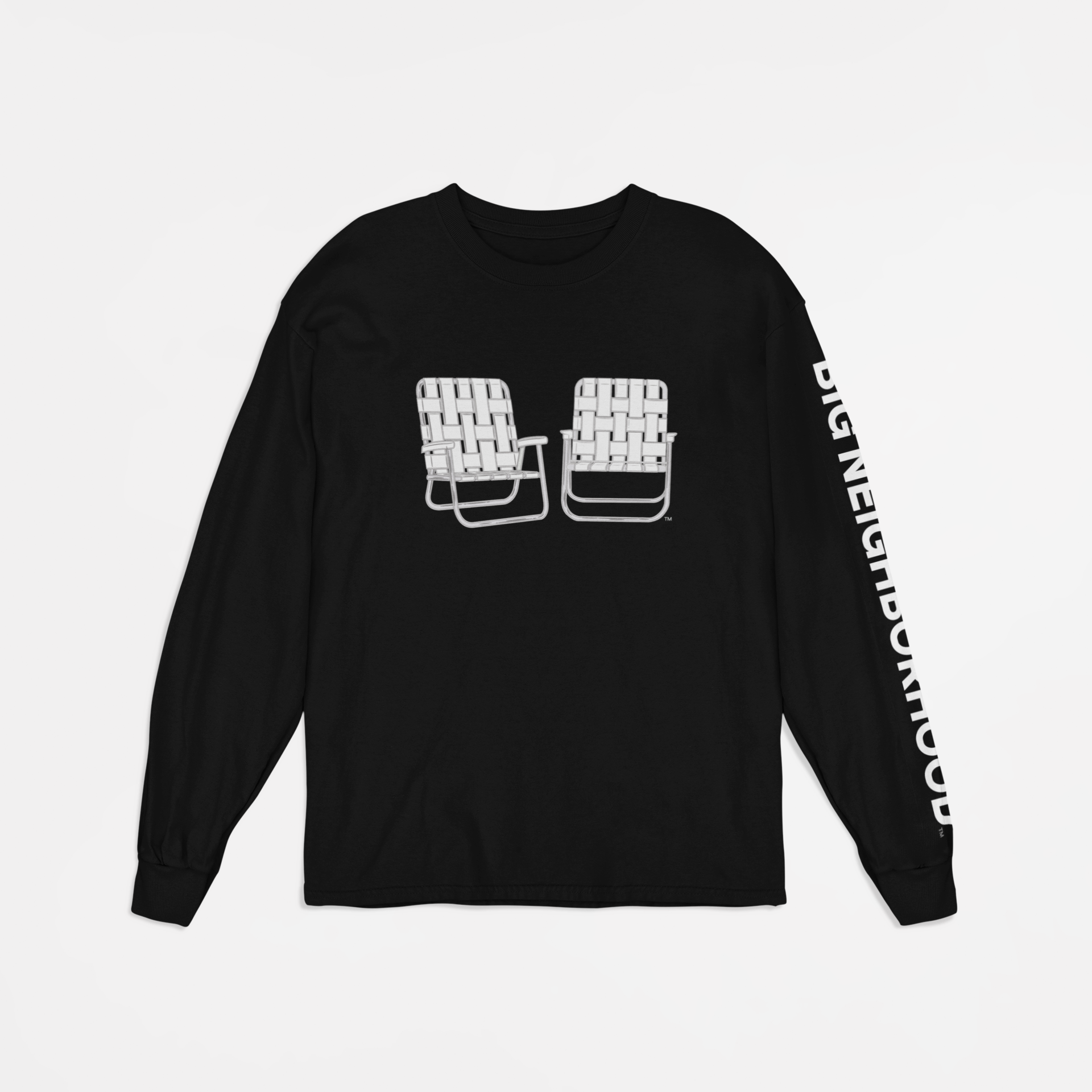 The Classic Big Chairs style. 2 x-large chairs icon screened in white or black on the front and Big Neighborhood logo down the sleeve.