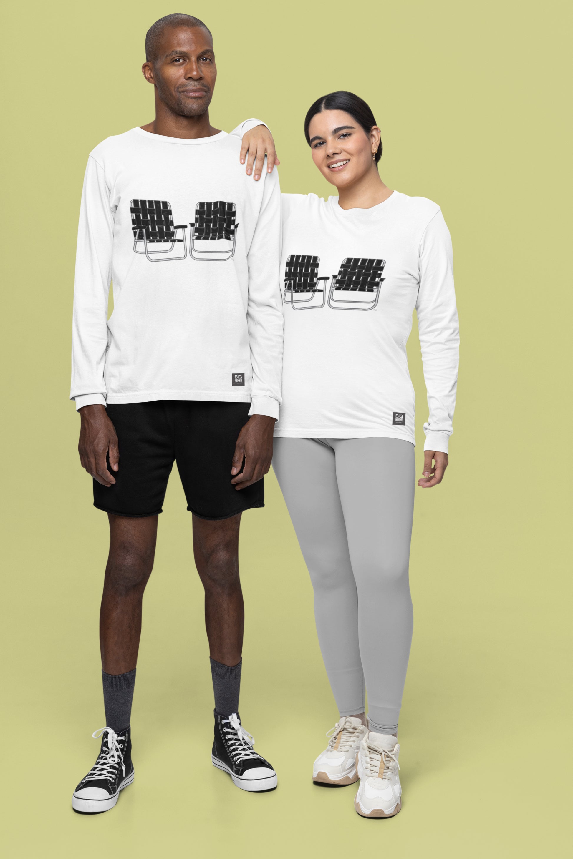 The Classic Big Chairs style. 2 x-large chairs icon screened in white or black on the front and a Big Neighborhood woven patch on the front.