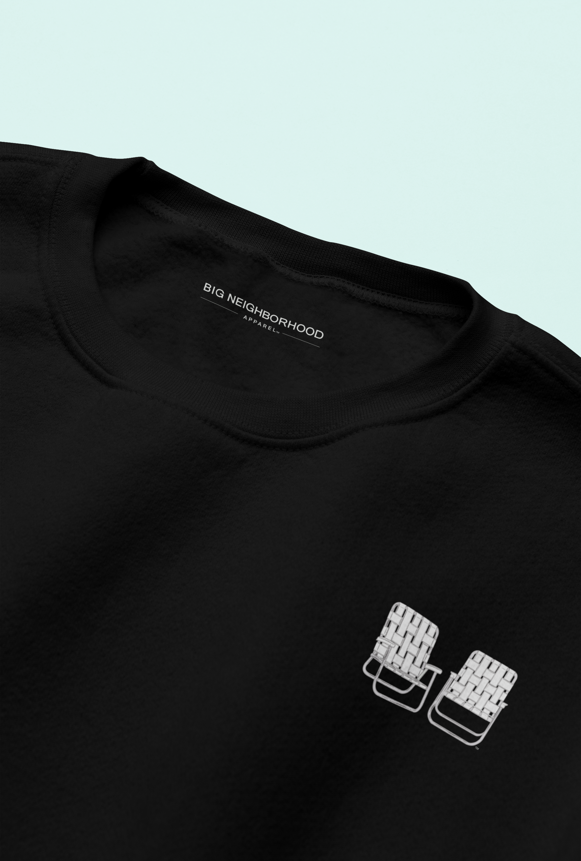 The Original Big Neighborhood style. 2 chairs icon screened in white or black on the front and Big Neighborhood square logo on the the back.